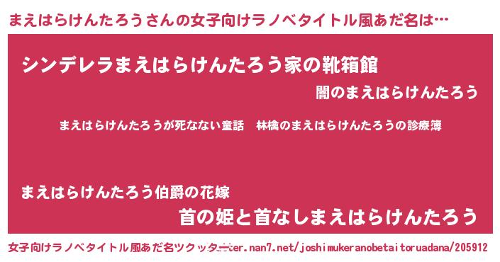 | 男性向けラノベタイトル風あだ名 | 『魔弾の王とまえはらけんたろう』 |