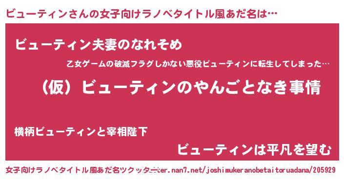 | 男性向けラノベタイトル風あだ名 | 『ビューティンの憂鬱』 |