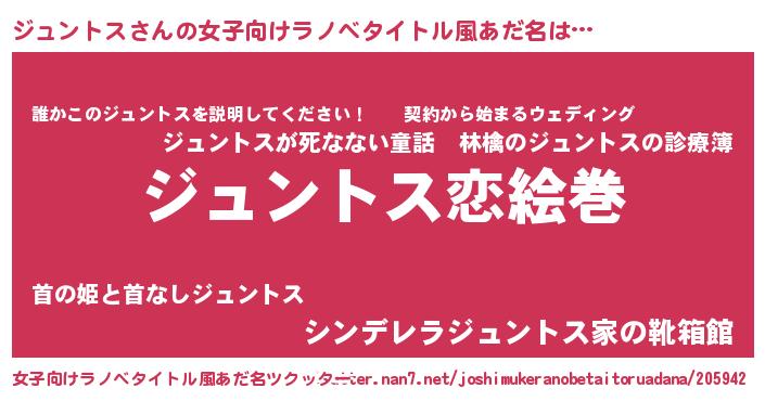 | 男性向けラノベタイトル風あだ名 | 『おまえをオタクにしてやるから、俺をジュントスにしてくれ! 』 |