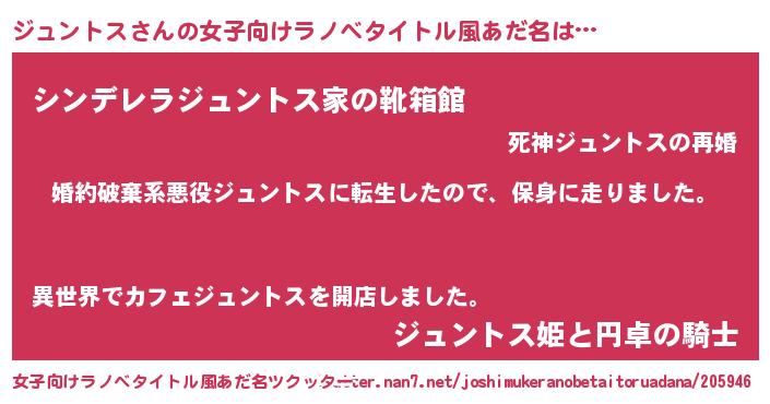 | 男性向けラノベタイトル風あだ名 | 『転生したらジュントスだった件』 |