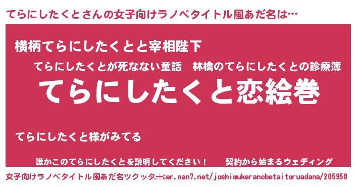 | 男性向けラノベタイトル風あだ名 | 『ノーゲーム・ノーテラニシタクト』 |
