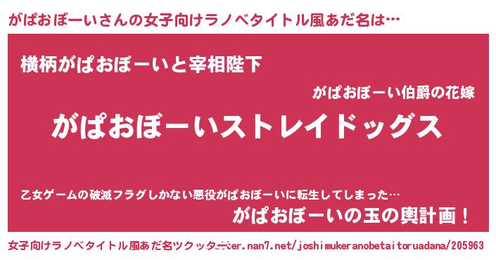 | 男性向けラノベタイトル風あだ名 | 『Re:がぱおぼーいから始める異世界生活』 |