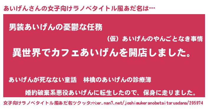 あいげんさんの女子向けラノベタイトル風あだ名は… 『異世界でカフェあいげんを開店しました。』『男装あいげんの憂鬱な任務』『婚約破棄系悪役あいげんに転生したので、保身に走りました。』 ツクッター #女子向けラノベタイトル風あだ名ツクッター http://tkutter.nan7.net/joshimukeranobetaitoruadana/205974/