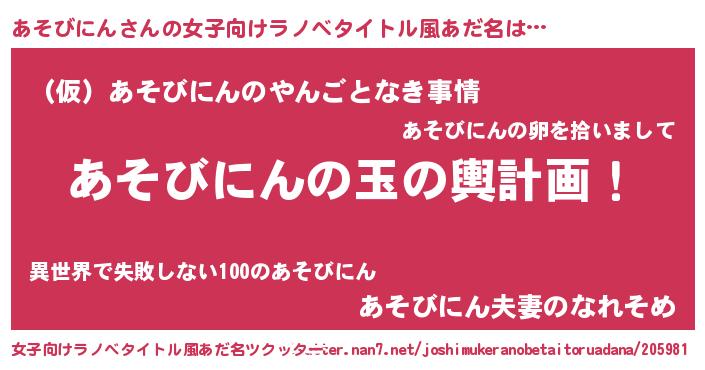 | 男性向けラノベタイトル風あだ名 | 『あそびにん~年齢イコール彼女いない歴の魔法使い~』 |
