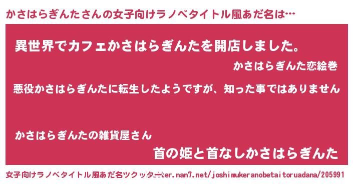 | 男性向けラノベタイトル風あだ名 | 『この素晴らしい世界にかさはらぎんたを!』 |