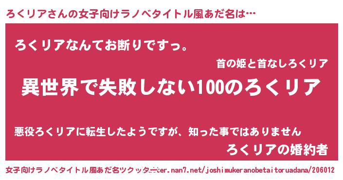 | 男性向けラノベタイトル風あだ名 | 『ろくリアという概念が存在しない退屈な世界 』 |