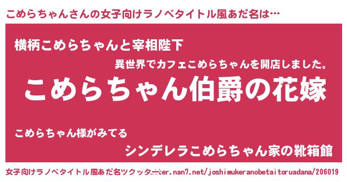 男性向けラノベタイトル風あだ名 | 『うちの娘の為ならば、俺はもしかしたらこめらちゃんも倒せるかもしれない。』 |