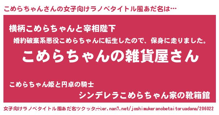 | 男性向けラノベタイトル風あだ名 | 『やはりこめらちゃんの青春ラブコメはまちがっている 』 |