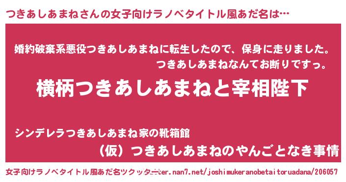 | 男性向けラノベタイトル風あだ名 | 『つきあしあまねに滅ぼされるだけの簡単なお仕事です』 |
