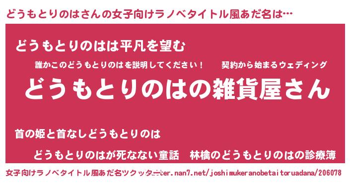 | 男性向けラノベタイトル風あだ名 | 『やはりどうもとりのはの青春ラブコメはまちがっている 』 |