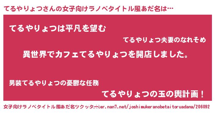 てるやりょつさんの女子向けラノベタイトル風あだ名は… 『異世界でカフェてるやりょつを開店しました。』『てるやりょつは平凡を望む』『てるやりょつの玉の輿計画!』 ツクッター #女子向けラノベタイトル風あだ名ツクッター http://tkutter.nan7.net/joshimukeranobetaitoruadana/206092/
