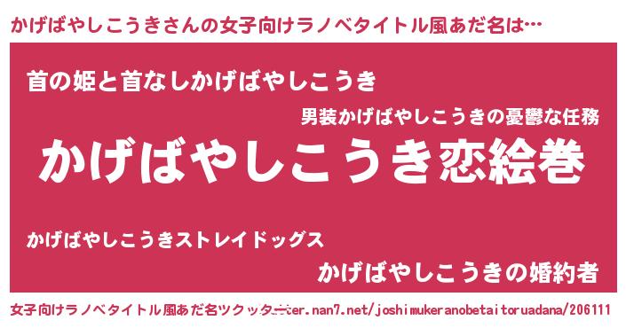 | 男性向けラノベタイトル風あだ名 | 『おまえをオタクにしてやるから、俺をかげばやしこうきにしてくれ! 』 |