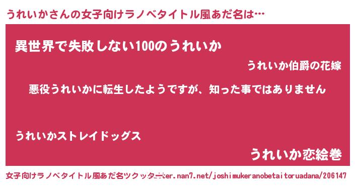 | 男性向けラノベタイトル風あだ名 | 『この素晴らしい世界にうれいかを!』 |