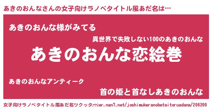 | 男性向けラノベタイトル風あだ名 | 『おまえをオタクにしてやるから、俺をあきのおんなにしてくれ! 』 |