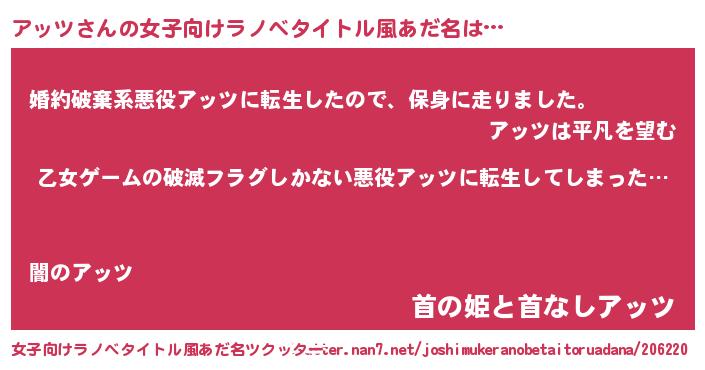 | 男性向けラノベタイトル風あだ名 | 『この素晴らしい世界にアッツを!』 |