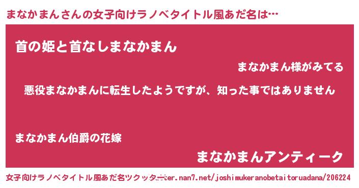 | 男性向けラノベタイトル風あだ名 | 『この素晴らしい世界にまなかまんを!』 |