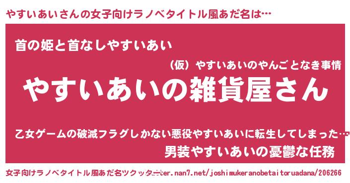 | 男性向けラノベタイトル風あだ名 | 『やはりやすいあいの青春ラブコメはまちがっている 』 |