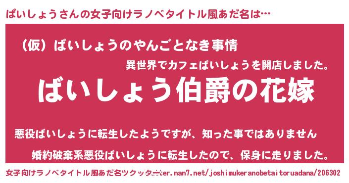 | 男性向けラノベタイトル風あだ名 | 『やはりばいしょうの青春ラブコメはまちがっている 』 |