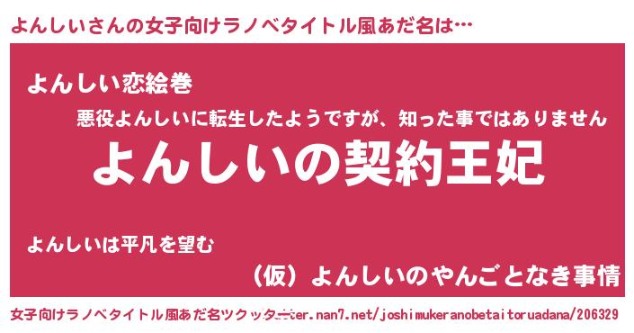 男性向けラノベタイトル風あだ名 | 『誰もが恐れるあのよんしいが、ぼくの専属メイドになるようです。』 |