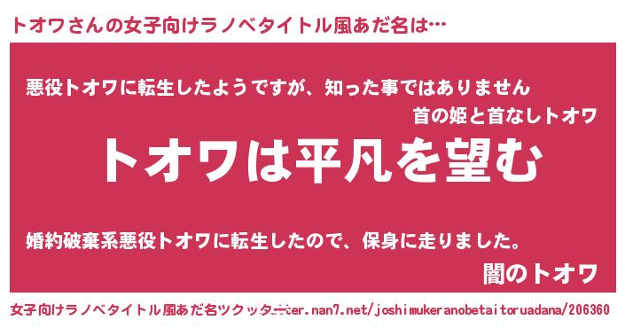 男性向けラノベタイトル風あだ名 | 『ダンジョンにトオワを求めるのは間違っているだろうか』 |