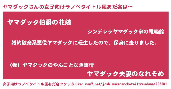 男性向けラノベタイトル風あだ名 | 『ヤマダックスレイヤー』 |