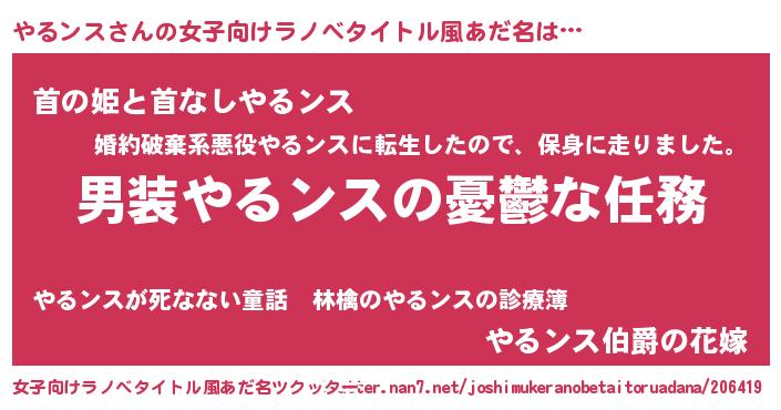 やるンスさんの女子向けラノベタイトル風あだ名は… 『男装やるンスの憂鬱な任務』『首の姫と首なしやるンス』『やるンス伯爵の花嫁』 ツクッター #女子向けラノベタイトル風あだ名ツクッター http://tkutter.nan7.net/joshimukeranobetaitoruadana/206419/