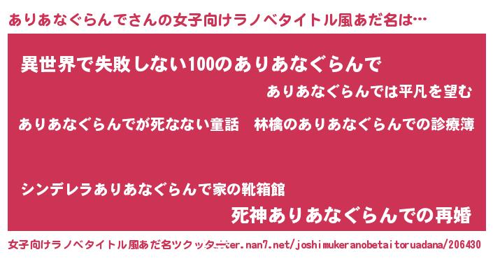 | 男性向けラノベタイトル風あだ名 | 『魔弾の王とありあなぐらんで』 |