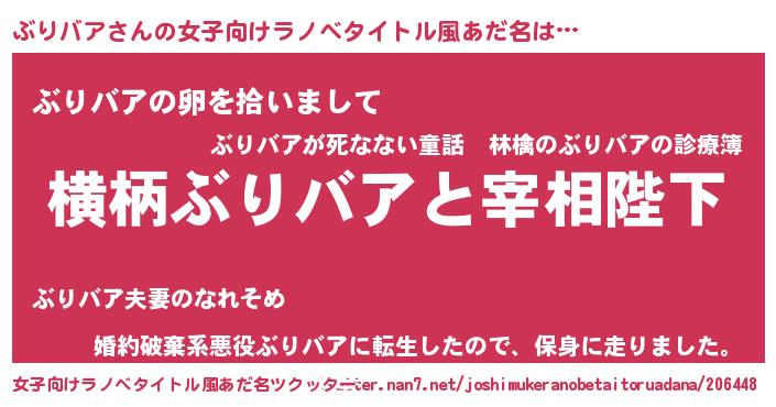 | 男性向けラノベタイトル風あだ名 | 『ぶりバアに滅ぼされるだけの簡単なお仕事です』 |