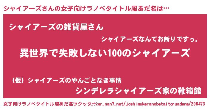 | 男性向けラノベタイトル風あだ名 | 『シャイアーズという概念が存在しない退屈な世界 』 |