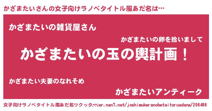 | 男性向けラノベタイトル風あだ名 | 『かざまたい~年齢イコール彼女いない歴の魔法使い~』 |
