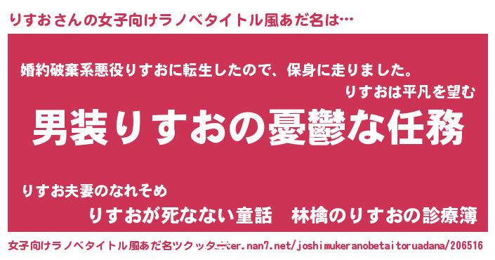| 男性向けラノベタイトル風あだ名 | 『冴えないりすおの育てかた』 |