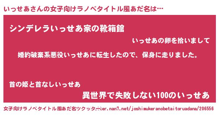 いっせあさんの女子向けラノベタイトル風あだ名は… 『婚約破棄系悪役いっせあに転生したので、保身に走りました。』『シンデレラいっせあ家の靴箱館』『異世界で失敗しない100のいっせあ』 ツクッター #女子向けラノベタイトル風あだ名ツクッター http://tkutter.nan7.net/joshimukeranobetaitoruadana/206556/