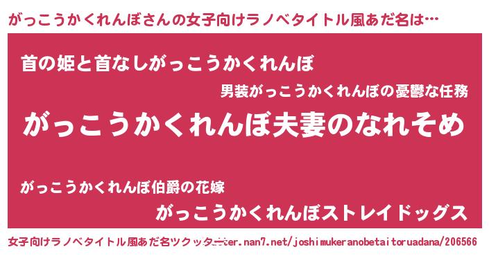 | 男性向けラノベタイトル風あだ名 | 『おまえをオタクにしてやるから、俺をがっこうかくれんぼにしてくれ! 』 |