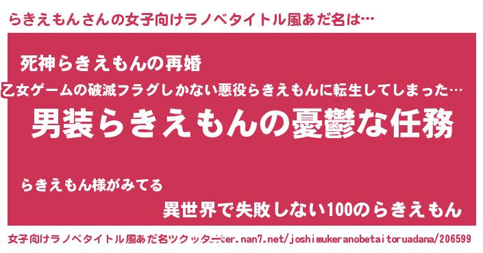 男性向けラノベタイトル風あだ名 | 『うちのらきえもんが世界を掌握している!』 |