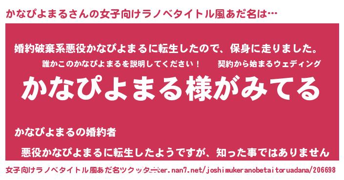 | 男性向けラノベタイトル風あだ名 | 『かなぴよまるの嫁は女の子じゃないと思った?』 |