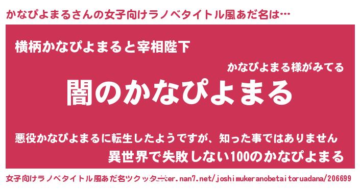 | 男性向けラノベタイトル風あだ名 | 『Re:かなぴよまるから始める異世界生活』 |