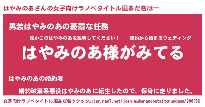 | 男性向けラノベタイトル風あだ名 | 『はやみのあの嫁は女の子じゃないと思った?』 |