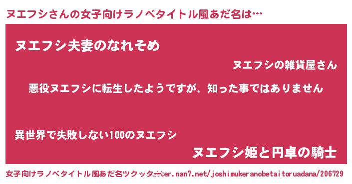 男性向けラノベタイトル風あだ名 | 『この素晴らしい世界にヌエフシを!』 |