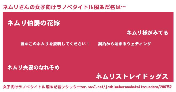 | 男性向けラノベタイトル風あだ名 | 『ネムリアートオンライン』 |