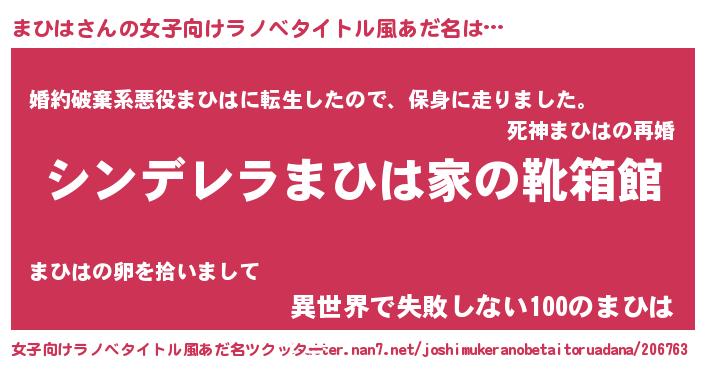 | 胡散臭い通販商品みたいなあだ名 | 『絶対に幸福をもたらす水素水…その名も「まひは」』 |