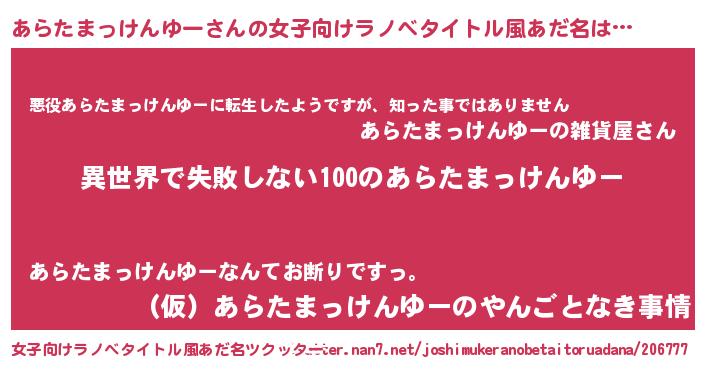 | 胡散臭い通販商品みたいなあだ名 | 『絶対に幸福をもたらす健康食品…その名も「あらたまっけんゆー」』 |