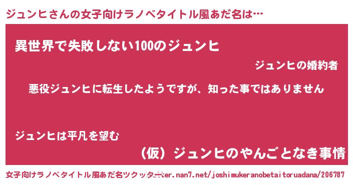| 男性向けラノベタイトル風あだ名 | 『この素晴らしい世界にジュンヒを!』 |