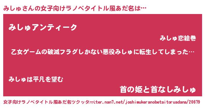 | 男性向けラノベタイトル風あだ名 | 『魔弾の王とみしゅ』 |