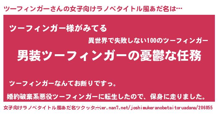 男性向けラノベタイトル風あだ名 | 『冴えないツーフィンガーの育てかた』 |