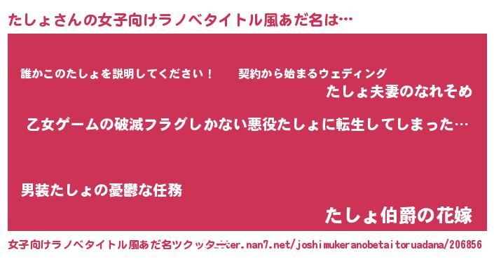 男性向けラノベタイトル風あだ名 | 『魔弾の王とたしょ』 |