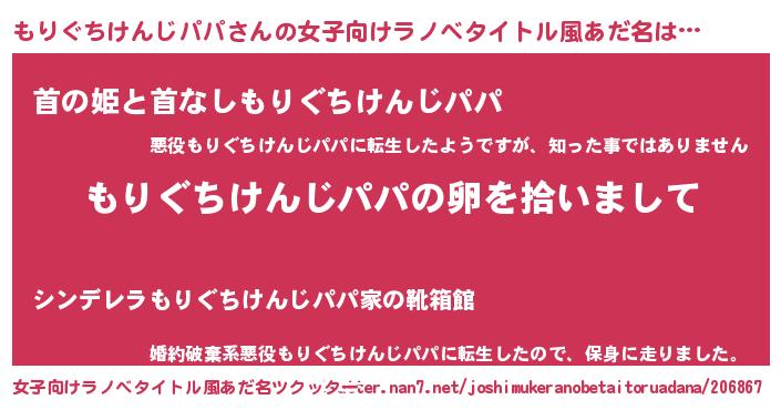 男性向けラノベタイトル風あだ名 | 『ダンジョンにもりぐちけんじパパを求めるのは間違っているだろうか』 |