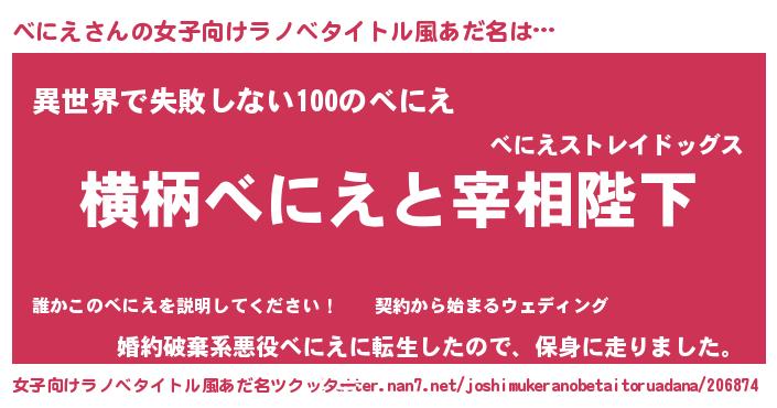 べにえさんの女子向けラノベタイトル風あだ名は… 『横柄べにえと宰相陛下』『異世界で失敗しない100のべにえ』『婚約破棄系悪役べにえに転生したので、保身に走りました。』 ツクッター #女子向けラノベタイトル風あだ名ツクッター http://tkutter.nan7.net/joshimukeranobetaitoruadana/206874/