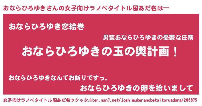 男性向けラノベタイトル風あだ名 | 『おならひろゆき~年齢イコール彼女いない歴の魔法使い~』 |