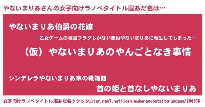 男性向けラノベタイトル風あだ名 | 『やないまりあの憂鬱』 |