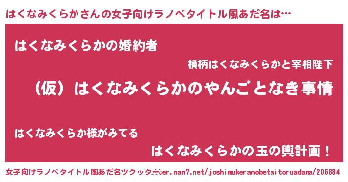 はくなみくらかさんの女子向けラノベタイトル風あだ名は… 『(仮)はくなみくらかのやんごとなき事情』『はくなみくらかの婚約者』『はくなみくらかの玉の輿計画!』 ツクッター #女子向けラノベタイトル風あだ名ツクッター http://tkutter.nan7.net/joshimukeranobetaitoruadana/206884/